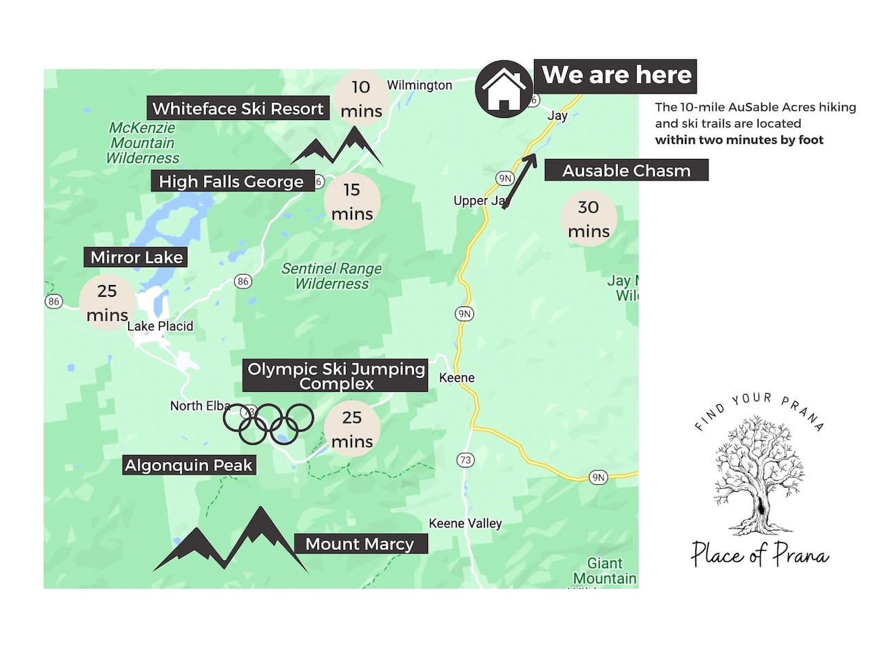 ✨ What You’ll Love: • Sleep Peacefully: 1 king bed + 1 king bed + 2 twin memory foam beds which can be converted into a king upon request; sleeps up to 6 comfortably • Wellness Touches: Private hot tub, massage chair, and red light therapy • Cozy Up: 2 living rooms, fireplaces, Roku TVs, and a vinyl record collection • Cook & Dine In: Fully stocked kitchen, Keurig coffee, and seating for 6 • Recharge Quietly: Reading nook + dedicated workspace for remote work or journaling • Outdoor Bliss: Wrap-around deck, forest views, Blackstone griddle, and stargazing from the hot tub • Fire Pit Evenings: Adirondack chairs, starry skies, and s’more-ready vibes 🗣 Why Guests Love It: "A peaceful place to finally relax." Thoughtful design + luxurious comfort = the ultimate retreat & adventure basecamp. 🌎 Explore Nearby: • Whiteface Mountain – 12 min: Skiing, hiking & stunning views • Lake Placid – 24 min: Olympic charm, lakeside strolls & local dining 🧘♀️ Ready to Rejuvenate? Book The Place of Prana today for a peaceful, cozy, and soul-nourishing Adirondack escape.